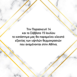 Το κατάστημα μας στη Νεοφύτου Βάμβα 10 στο Κολωνάκι θα παραμείνει κλειστό την Παρασκευή 14 και το Σάββατο 15 Ιουλίου εξαιτίας των υψηλών θερμοκρασιών που αναμένονται στην Αθή...