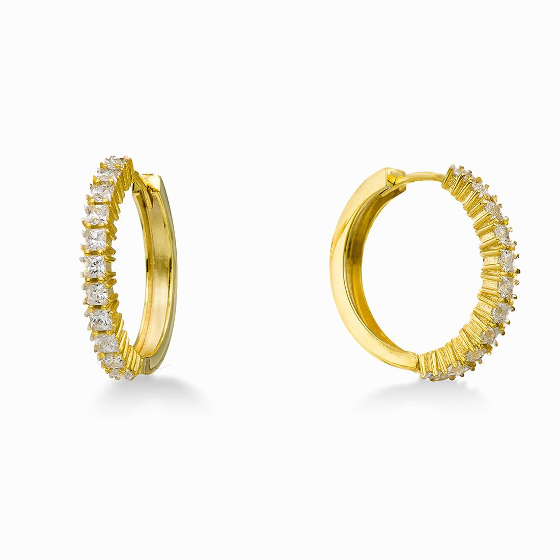 Delicate hoop earrings in 925 sterling silver with 18K yellow gold plating, adorned with white CZ stones. Made to order and dispatched within 10 working days.