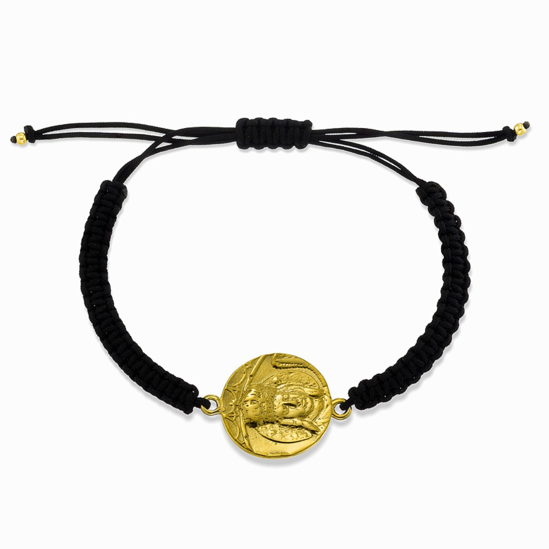Adjustable black cord bracelet featuring an impressive circular 925 silver plate with 18K yellow gold plating, embossed with Archangel Michael. Made to order and dispatched within 10 working days.